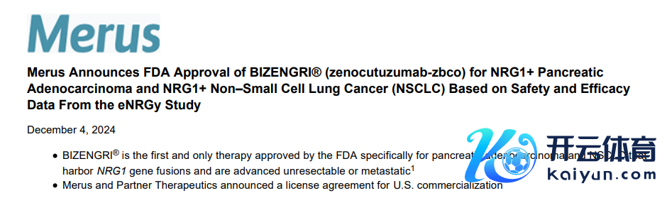 12月4日,Merus秘书FDA加速批准其HER2/HER3双抗Zenocutuzumab上市,用于调理神经调遣卵白 1 交融 (NRG1+) 非小细胞肺癌 (NSCLC) 和 NRG1+ 胰腺导管腺癌 (PDAC) 患者,商品名为Bizengri。
