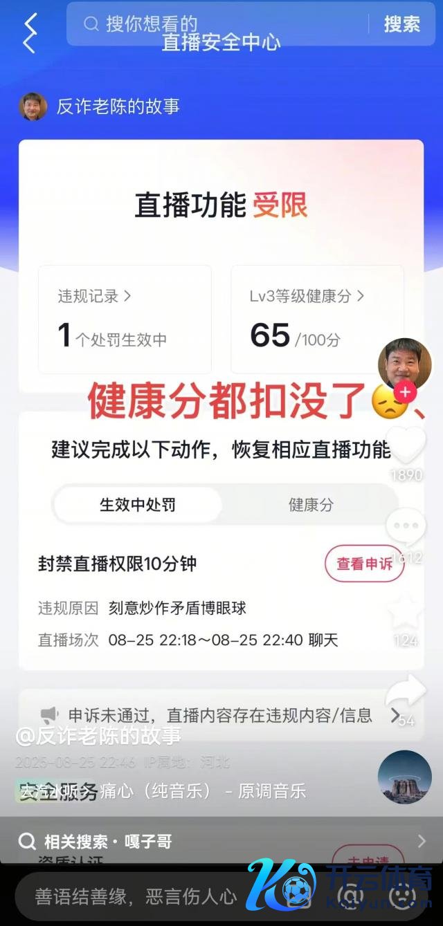 此外,反诈老陈还发布了一张截图,案牍为"健康分皆扣没了"。相片内容炫耀,在 8 月 25 日的直播中,反诈老陈的直播间因刻意炒作矛盾博眼球,被封禁直播权限 10 分钟。
