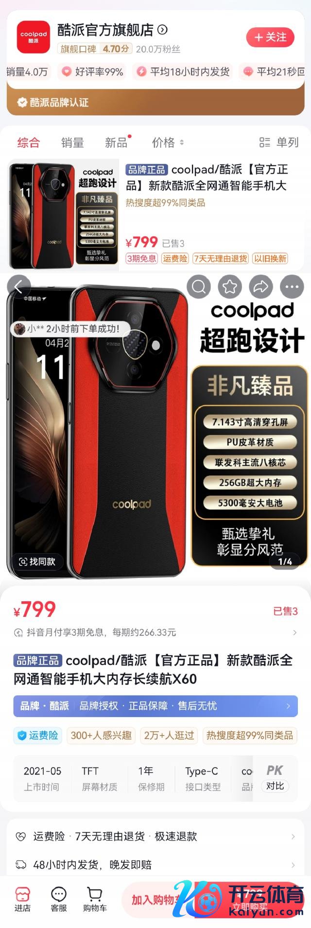 8 月 26 日,赵云合搜索发现,抖音酷派官方旗舰店仍是上架酷派 X60 手机,售价 799 元,比嘎子哥直播间的价钱高一百。
