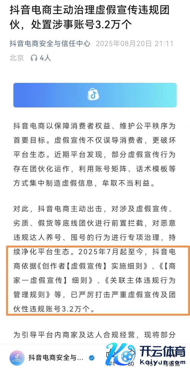 值得庆祝的是,2025 年 7 月起于今,抖音电商依据《创作家【乖谬宣传】现实确定》、《【商家—乖谬宣传】确定》、《关联主体非法行为料理限定》等,已严厉打击严重乖谬宣传及团伙性非法账号 3.2 万个。