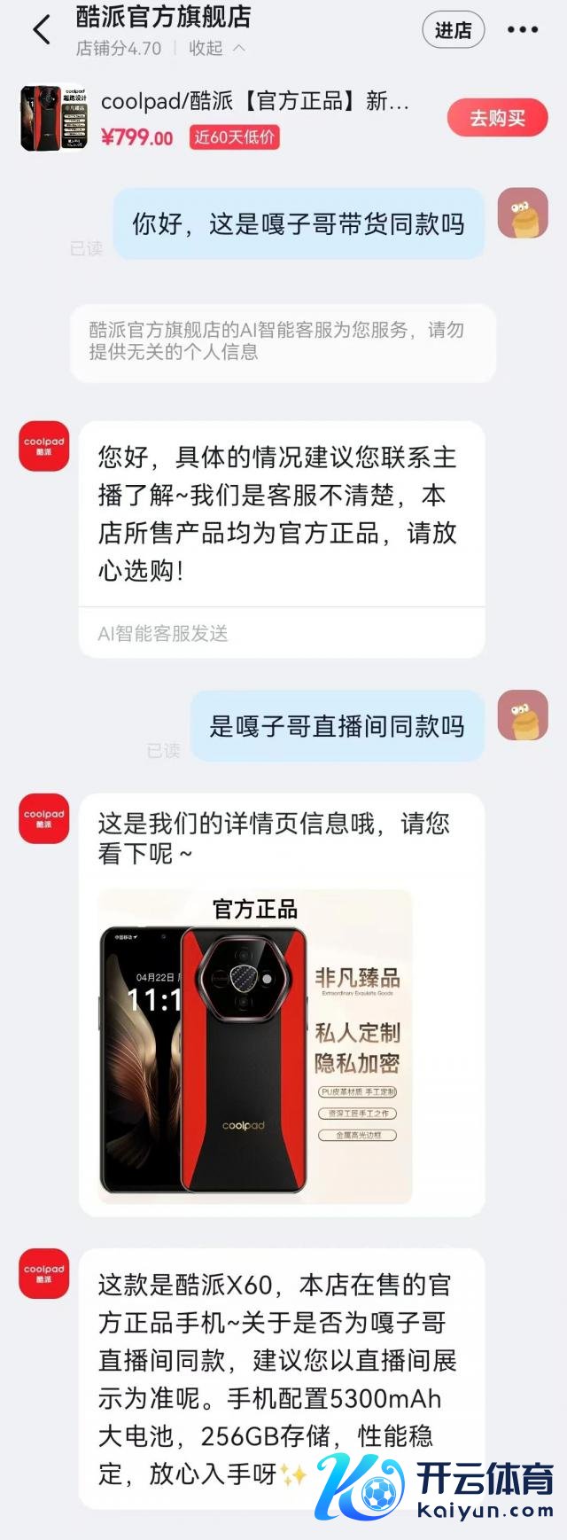 同期,赵云合也去斟酌了客服"该款手机是否为嘎子哥带货同款",客服并未正面回话,只示意该店铺所售家具均为官梗直品。