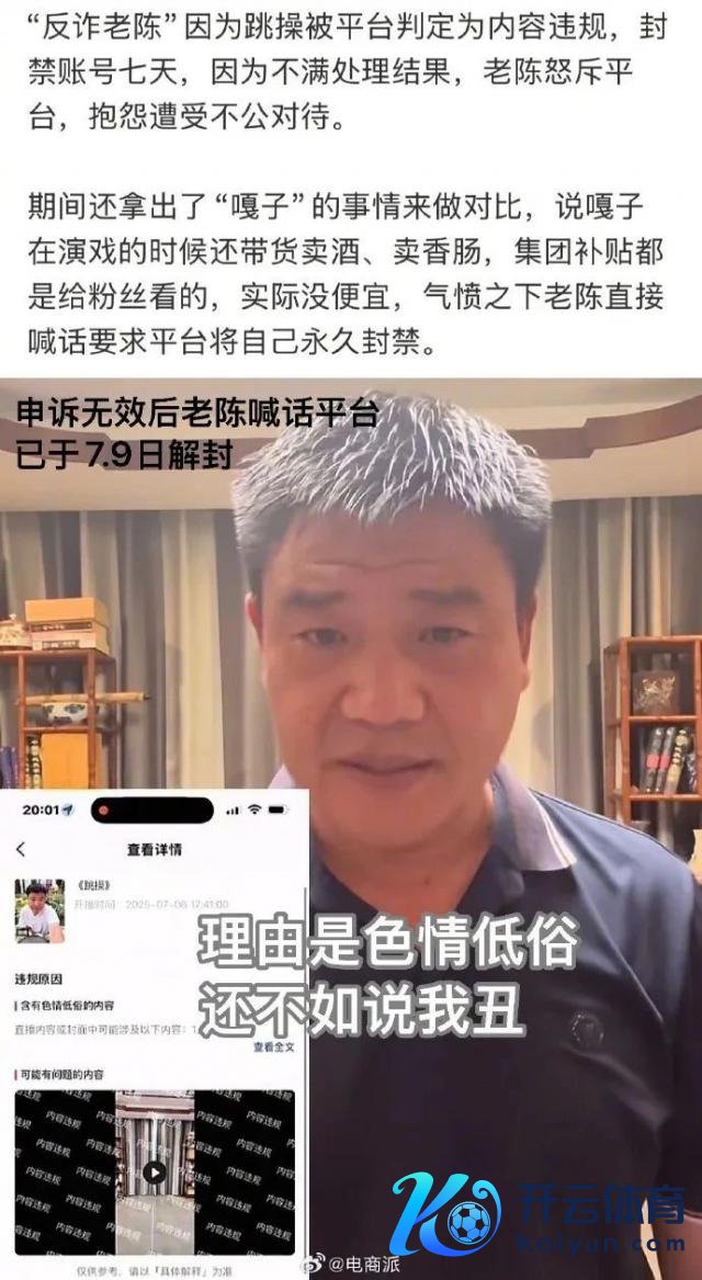 同期,反诈老陈还清楚,发布打假视频当晚,他的账号被平台以色情低俗为由封禁 7 天。对此,反诈老陈叱咤平台双标,演戏带货的不封,我方跳个操就被说低俗。